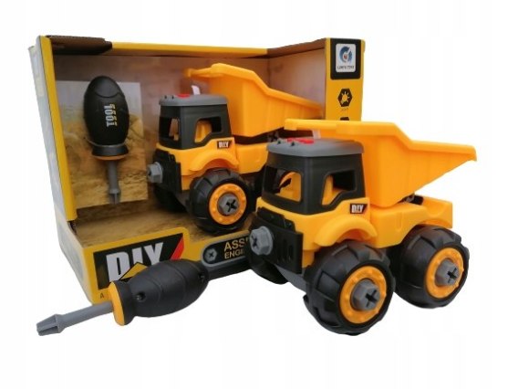 Samochód wywrotka do skręcania wraz z śrubokrętem pomagającymi dziecku w odkręceniu śrubek w pojeździe. Dziecko poprzez zabawę nauczy się obsługiwać narzędzia przydatne w dorosłym życiu .Zabawka zapakowana jest w kartonowe opakowanie .Produkt dla dzieci od 3 roku życia.