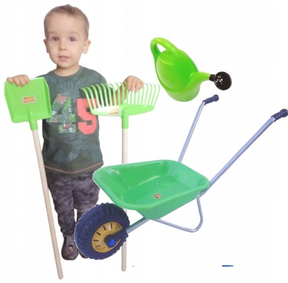 SKŁAD ZESTAWU: TACZKI DZIECIĘCE (z elementami metalowymi) + NARZĘDZIA ( grabki do liści oraz łopata)+konewka