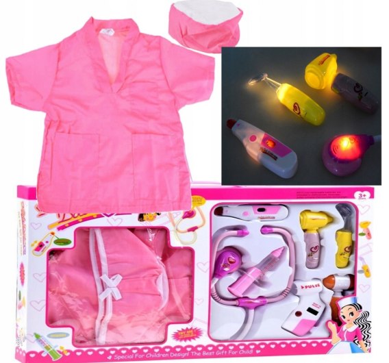 Przedstawione instrumenty medyczne są imitacjami prawdziwych przyrządów lekarskich, którym nadano przyjazne kształty i żywe kolory. Posiadają efekty świetlne i dźwiękowe, imitujące np. pracę serca. Zestaw jest idealnym prezentem dla młodej służby zdrowia. Sprawi na pewno mnóstwo radości we wspólnej zabawie i dużym i mały. Bardzo kolorowy i efektowny sprawdzi się w niejednym domowym ośrodku zdrowia.